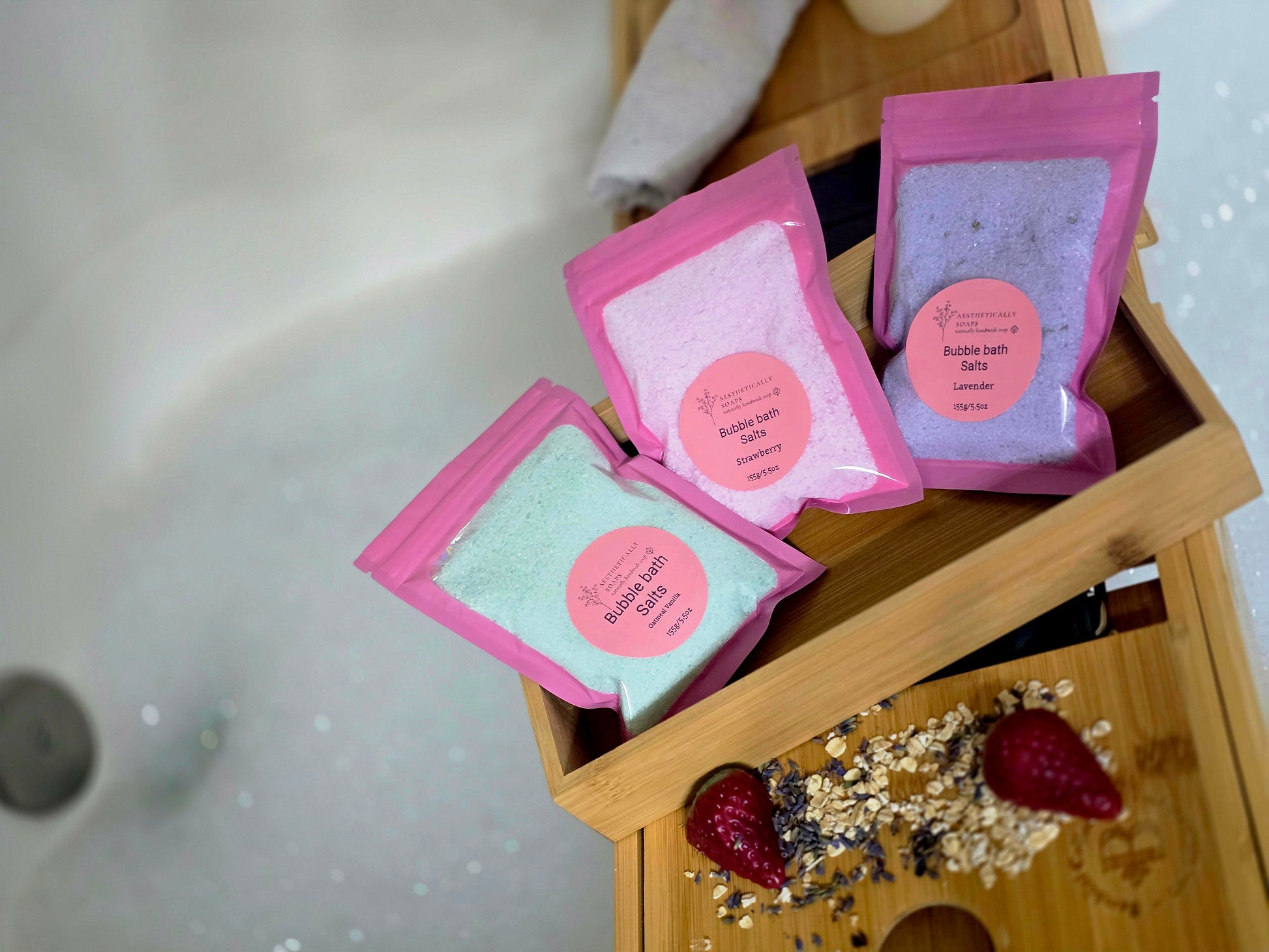Our Bubble Bath Salts are a unique blend of soothing bath salts and gentle bubbling agents designed to relax tired muscles, soften skin, and fill your tub with luxurious foam. As the salts dissolve, they release a beautiful scent that transforms your bath into a calming spa experience. Ideal for self-care nights, gifting, or everyday relaxation.