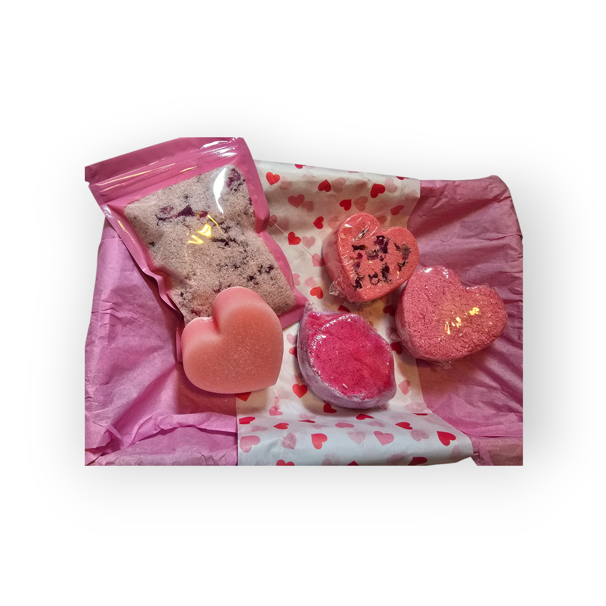 Enjoy all the newest valintines day bath bombs, heart shapped sugar scrub bar and a rose scented bubble bath salts!